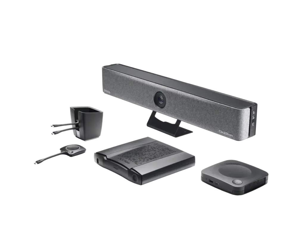 ClickShare jest dostępny w trzech seriach: bezprzewodowe rozwiązania konferencyjne do bezproblemowej hybrydowej współpracy, uniwersalne paski wideo zapewniające ostry obraz i czysty dźwięk podczas hybrydowych spotkań oraz bezprzewodowe rozwiązania prezentacyjne do udostępniania treści podczas spotkań twarzą w twarz.