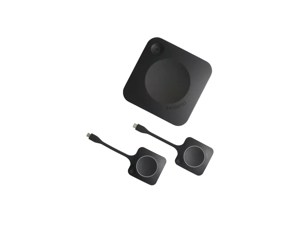 System ClickShare współpracuje z różnymi urządzeniami, takimi jak laptopy z systemem Windows i macOS, a także smartfony i tablety z systemami Android i iOS. Użytkownicy mogą korzystać z dedykowanego przycisku USB, który po podłączeniu do laptopa umożliwia natychmiastowe udostępnienie ekranu na wyświetlaczu. Alternatywnie, dostępna jest aplikacja ClickShare, działająca w tle i automatycznie łącząca się z odpowiednim wyświetlaczem w sali. Dodatkowo, system obsługuje popularne technologie transmisji bezprzewodowej, takie jak AirPlay i Miracast, co pozwala na szybkie i łatwe udostępnianie treści bez konieczności instalowania dodatkowego oprogramowania.